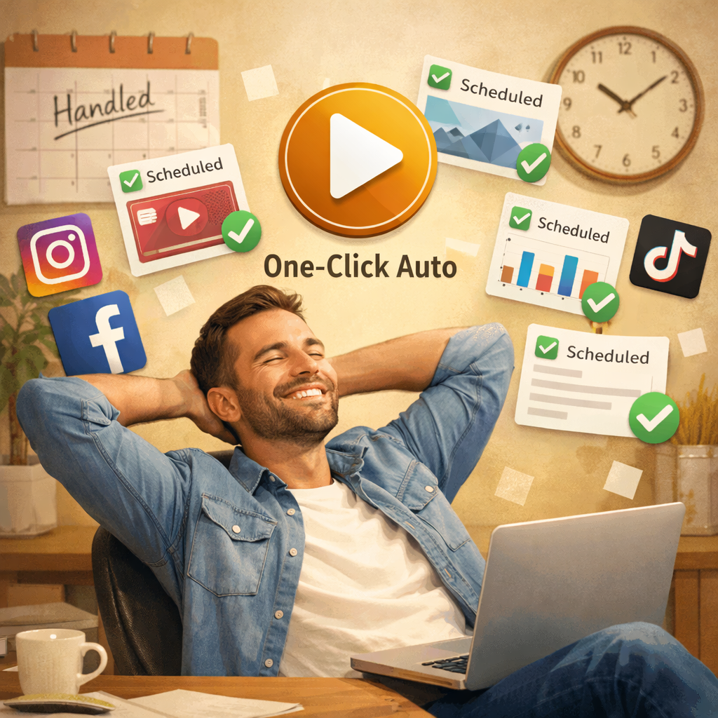 One click, AI does the rest – Design, write, and schedule your content instantly across all your socials.